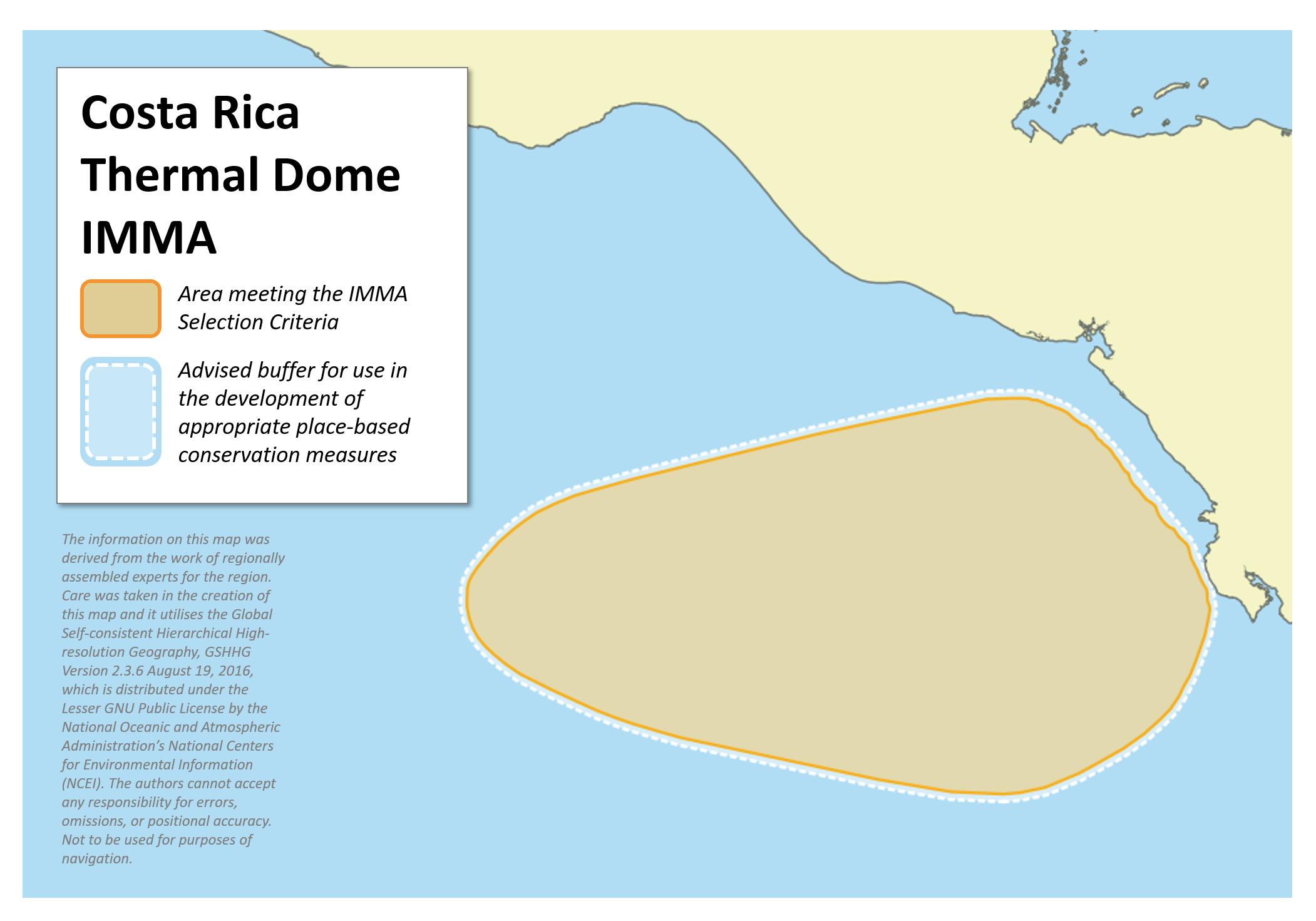 The Thermal Dome is located within and beyond the Exclusive Economic Zones (EEZs) of Central American countries in the Eastern Tropical Pacific. It is a phenomenon formed by the convergence of trade winds and sea currents that cause deep, cold and nutrient-rich waters to rise (upwelling). The thermocline is thus “lifted” up to about 15 meters from the surface, giving, through its bell shape, its name of “dome”. The size and location of the Thermal Dome is dynamic. Its average surface area is 530,000 km2. Its central zone is located around 9°N and 90°W, more than 65 km west of the borders of the EEZs of Costa Rica and Nicaragua, i.e. beyond their respective national jurisdictions.