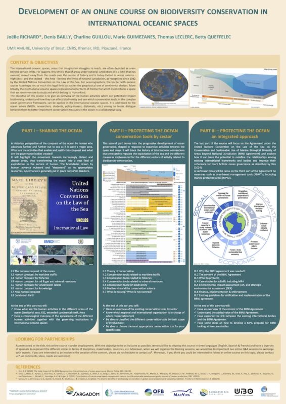 Agreement) was adopted by consensus in June 2023 with the goal “to ensure the conservation and sustainable use of marine biological diversity of areas beyond national jurisdiction, for the present and in the long term”. It addresses four primary topics: i) marine genetic resources including the fair and equitable sharing of benefits, ii) measures such as area-based management tools, including marine protected areas, iii) environmental impact assessments and iv) capacity building and the transfer of marine technology. Other existing instruments address specific geographies or specific issues. The BBNJ Agreement shall be applied in a manner that does not undermine relevant existing institutions, frameworks, and bodies.At the occasion of the UN Ocean Conference 2025, an online course on biodiversity conservation in the international oceanic spaces will be launched. It will expose the existing conservation tools to protect biodiversity from human activities in areas beyond national jurisdictions (ABNJ) and explore the added value of the BBNJ Agreement in relation to biodiversity conservation. The objective is to have an overview of the human activities which can potentially impact biodiversity, understand how they can affect biodiversity and see which conservation tools, in the complex ocean governance framework, can be applied. The last part of the course will focus on the BBNJ Agreement and explore how it can have the potential to redefine the relationships among existing international frameworks and bodies and improve their coherence for more holistic ocean governance as described by Kim (2024). The objective of this course is to acculturate the different ocean actors (NGOs, researchers, students, policy-makers, diplomats, etc.) aiming to foster dialogue between them to better implement conservation measures in the ocean in a collaborative way.